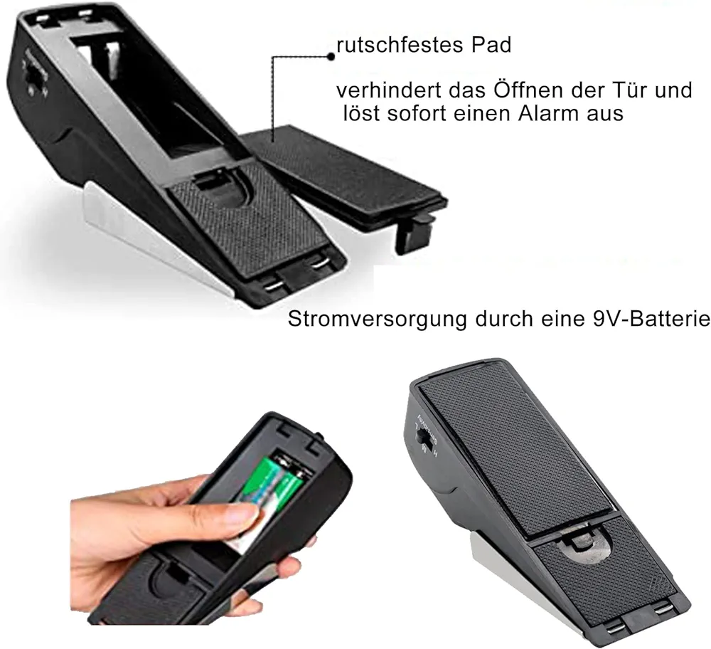 Aucun câblage n'est nécessaire, il suffit de mettre la pile 9 V dans la butée de porte, et de basculer le bouton sur « ON » pour fonctionner. Le fond est fabriqué en caoutchouc souple de qualité pour empêcher l'alarme de glisser.